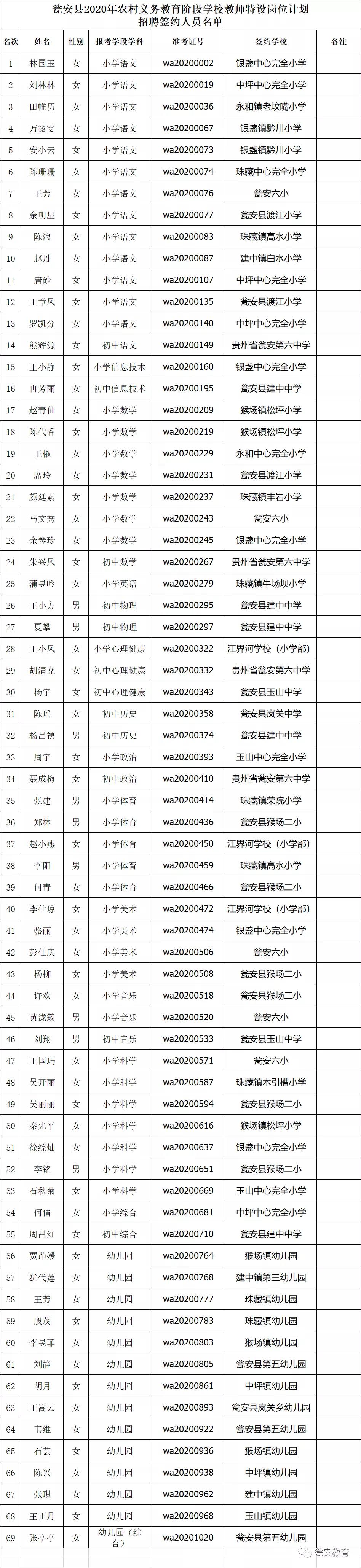 甕安縣2020年特崗教師招聘簽約人員名單公告